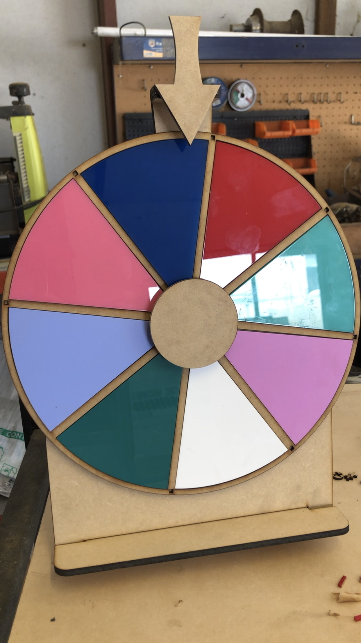 Made from acrylic and wood. Players give the wheel a spin, and wherever it stops, they win the prize indicated by the section the pointer lands on. The combination of acrylic and wood offers a visually appealing and durable construction, making it suitable for events, trade shows, parties, or marketing activities.